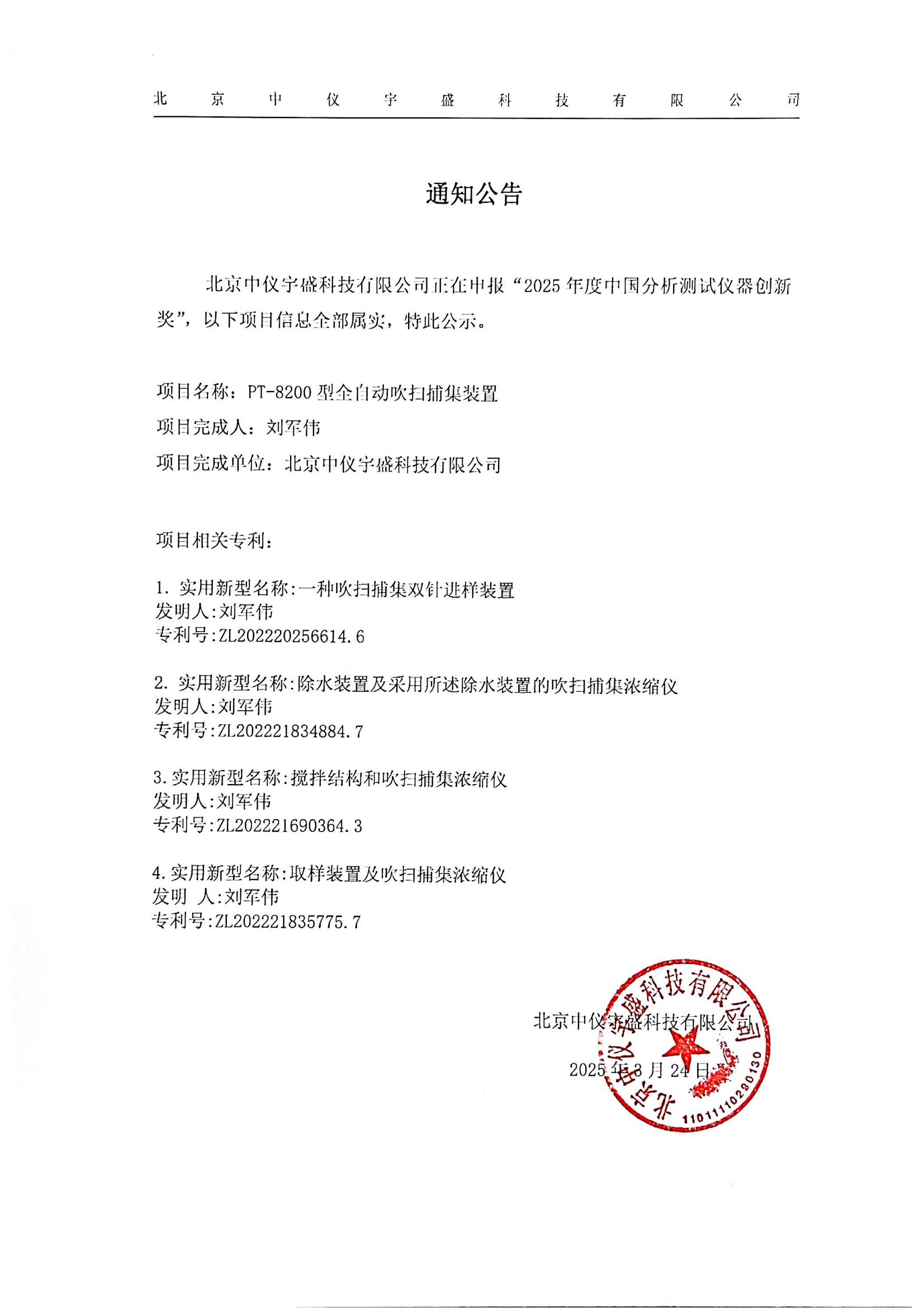 关于北京中仪宇盛申报“2025年度中国分析测试仪器创新奖”的公示