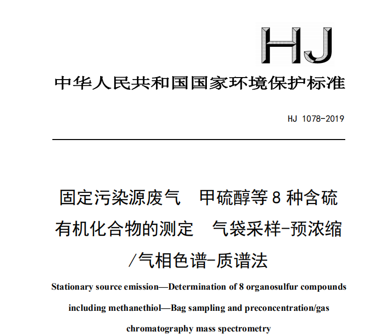 HJ1078-2019固定污染源废气甲硫醇等8种含硫有机化合物的测定气袋采样-预浓缩气相色谱-质谱法 警告:实验中所使用标准品均为易挥发的有毒化学品,试剂配制和样品前处理过程应在通风橱内进行,操作时应... 更新日期:2020-05-11 下载包(1)