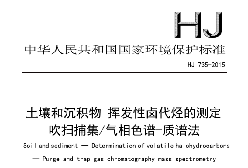 HJ735-2015土壤和沉积物挥发性卤代烃的测定吹扫捕集气相色谱-质谱法 本标准规定了测定土壤和沉积物中挥发性卤代烃的吹扫捕集/气相色谱-质谱法。 本标准适用... 更新日期:2020-04-01 下载包(1)