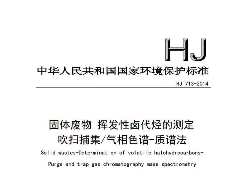 HJ 713-2014 固体废物 挥发性卤代烃的测定 吹扫捕集气相色谱-质谱法 本标准规定了测定固体废物中挥发性卤代烃的吹扫捕集/气相色谱-质谱法。 本标准适用于固体废物和固体... 更新日期:2020-04-01 下载包(1)